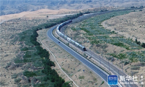 ↑一列火车行驶在穿越腾格里沙漠的包兰铁路上(6月12日无人机拍摄)。新华社记者 卢鹰 摄