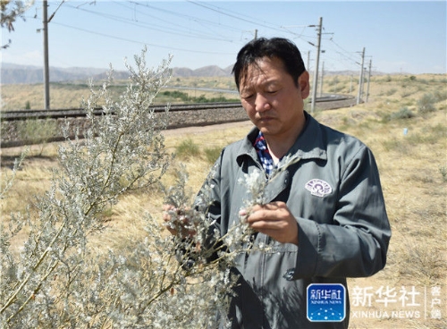 ↑宁夏中卫固沙林场副场长郜永贵在查看包兰铁路沿线的植被(6月12日摄)。新华社记者 卢鹰 摄