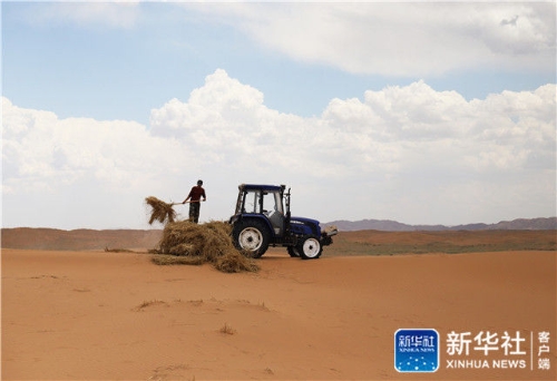 ↑一位工人在腾格里沙漠从铲车上卸下麦草(6月11日摄)。新华社记者 曹江涛 摄