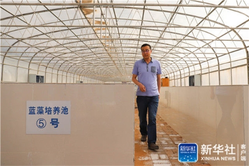 ↑中科院沙坡头沙漠研究试验站副站长张志山查看温棚中的蓝藻培育池。利用蓝藻制造人工“结皮”是目前站里正在探索的新技术(5月30日摄)。新华社记者 曹江涛 摄