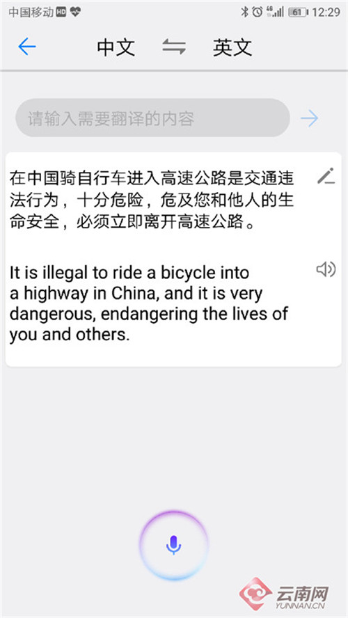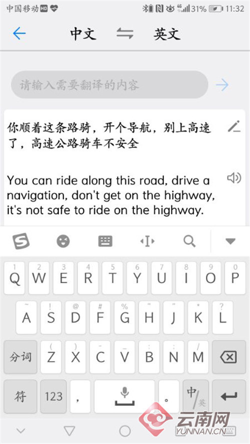 语言不通,无法交流怎么办呢?民警通过手机翻译软件告知这名老外称“在中国骑自行车上高速是违法行为,高速公路上骑行自行车非常危险,你的行为涉及你和他人的生命安全,必须立即离开高速公路”。