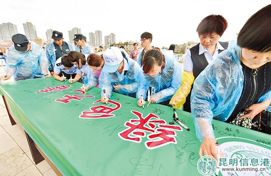 昨日,安宁市举行禁毒宣传活动,在昆钢日月湖广场开展系列普法活动,上万人在布标上签名拒绝毒品。