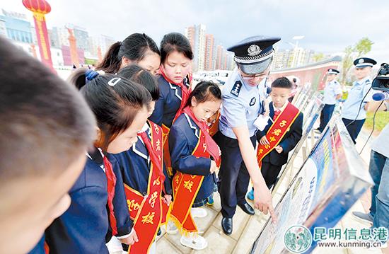 官渡民警为小志愿者讲解毒品危害。记者王俊星/摄