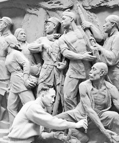 雕塑家创作浮雕《五四运动》。 资料图片 |