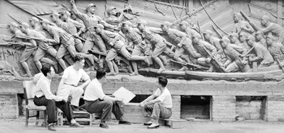 雕塑家与浮雕《胜利渡长江》。 天安门管委会宣传信息处提供 |
