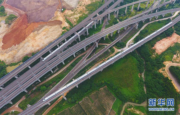 7月1日,动车在广西南宁市屯里大桥上行驶(无人机拍摄)。 新华社记者 黄孝邦 摄