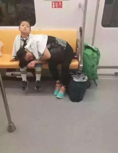 小男孩的妈妈困了,趴在他的腿上,小男孩不时拍拍妈妈,怕坐过站,每到一站时就告诉妈妈到哪站了。小时候妈妈保护我们,长大后要保护好妈妈,你一定是上帝派来保护妈妈的小天使。