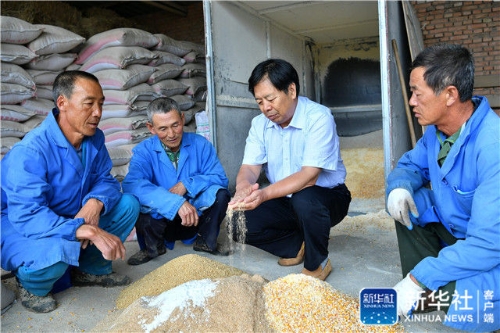 山西阳曲县杨兴乡坪里村村民刘学荣(左一)和工友们听山西农业大学董常生教授(右二)讲解如何制作精饲料。