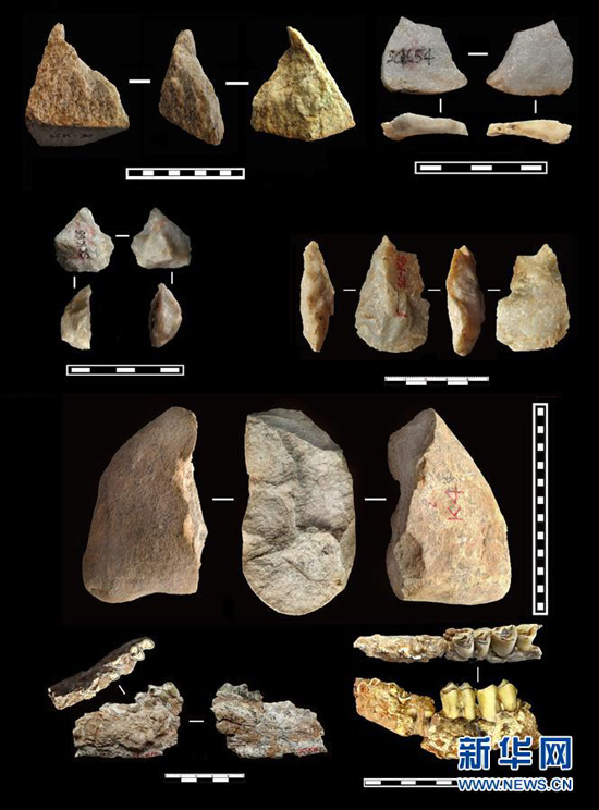 出土于上陈旧石器遗址的距今约212万年的部分旧石器和动物化石(资料照片)。新华社发