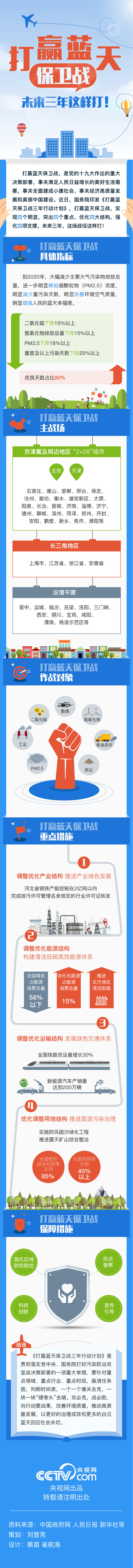 打赢蓝天保卫战,是党的十九大作出的重大决策部署,事关满足人民日益增长的美好生活需要,事关全面建成小康社会,事关经济高质量发展和美丽中国建设。近日,国务院印发《打赢蓝天保卫战三年行动计划》,打赢蓝天保卫战,实现四个明显,突出四个重点,优化四大结构,强化四项支撑,未来三年,这场战役这样打!