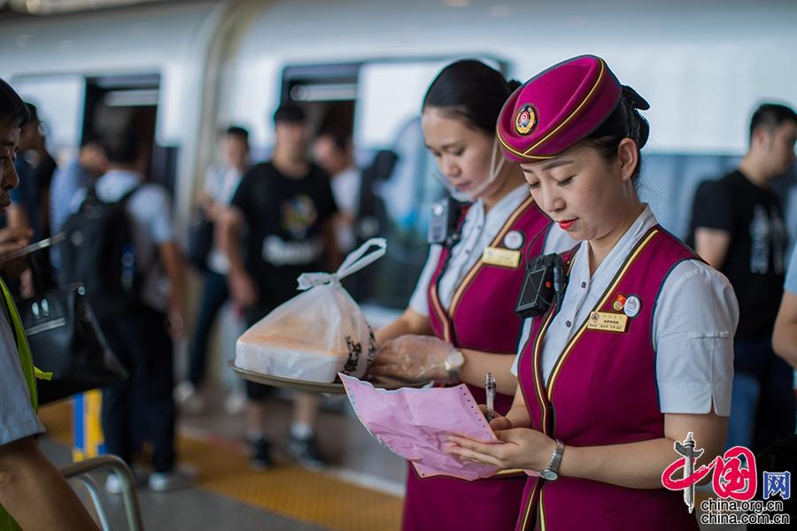 赵小琴与送餐的工作人员进行对接,领取车上乘客手机点餐的食品。在如今的高铁列车上乘客可以在途中进行手机点餐,选择变的更加丰富。而在普速列车的年代,乘客除了盒饭只能选择不同口味的方便面。作为一名经历过众多不同车型的铁路员工,赵小琴也见证了列车餐车的不断发展,从绿皮车的餐车到现在动车车组的餐吧,从内容单一的盒饭到花样丰富的套餐,种类丰富的列车美食让旅客可以在旅途中感受舌尖上的美味。中国网 郑亮摄