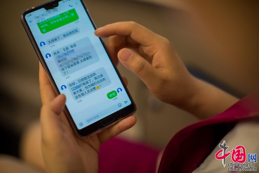 赵小琴认为作为一名列车长,除了在车上为乘客做好服务外,还将自己的服务延伸到车厢之外,从进站开始就努力让乘客感受到温暖。在她的手机上经常可以收到那些被她照顾过的重点旅客发来的求助信息和感谢短信。中国网 郑亮摄