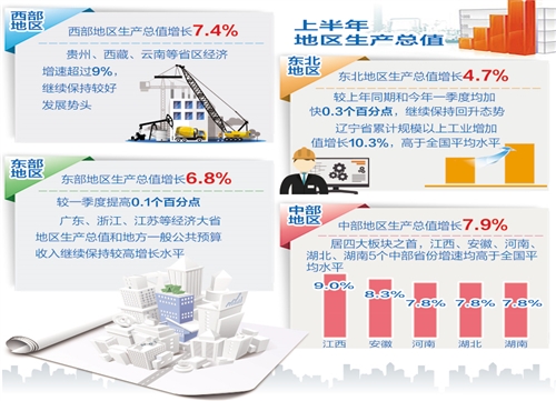西部地区保持较快增长。今年以来,沿边重点开发开放试验区加快推进,交通、水利、生态建设和环境保护等一批重点工程开工建设,脱贫攻坚取得积极成效,特色优势产业快速发展。上半年,西部地区生产总值增长7.4%,高于东部地区0.6个百分点。贵州、西藏、云南等省区经济增速超过9%,继续保持较好发展势头。