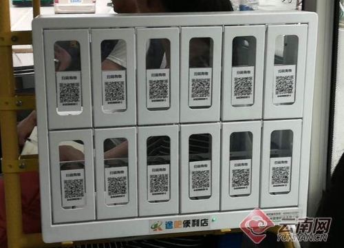 7月26日,记者乘坐昆明C63路公交车时发现,在靠门方向中间位置安装有一长约70厘米、宽约15厘米、高约40厘米的零售货架。此货架分为上下两层,共有12个窗格,每个窗格上都贴有二维码,乘客扫码付款后就能取走所需商品,俨然是一自动售货机。目前,窗格内还未放置商品。
