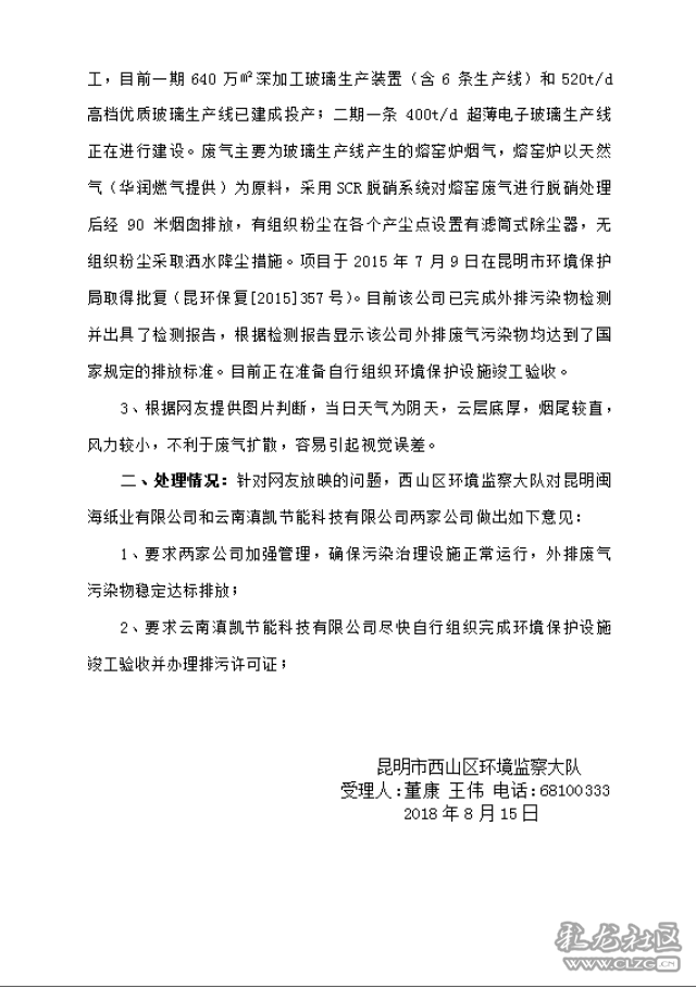一周后,西山区环境监察大队针对该事件做出书面回应《关于海口街区烟雾笼罩的处理情况的回复》。回复称“西山区环境监察大队执法人员根据图片线索到海口工业园区进行了现场比对调查。经查,图片上反映的冒烟囱主要为昆明闽海纤业有跟公瓦和云南滇凯节能科技有限公司两家公司所有(最远处为云南绿色能源有限公司的循环冷却塔和烟囱,排放情况图片不明)”,随后,监察大队对两家公司进行了深入调查。最终处理情况回复为“针对网友反映的问题,西山区环境监察大队对昆明闽海纸业有限公司和云南滇凯节能科技有限公司两家公司做出如下意见:1、要求两家公司加强管理,确保污染治理设施正常运行,外排废气污染物稳定达标排放;2、要求云南滇凯节能科技有限公司尽快自行组织完成环境保护设施竣工验收并办理排污许可证。”