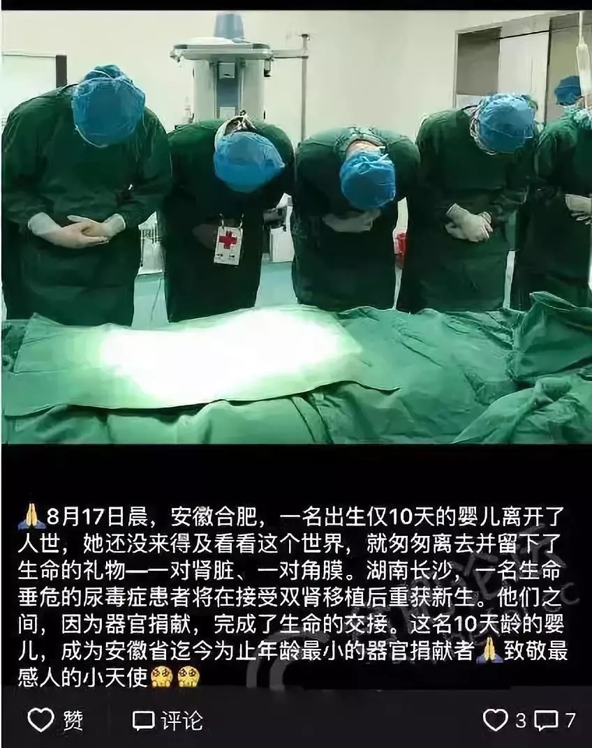 8月17日凌晨,中国科学技术大学附属第一医院(安徽省立医院)手术室里一台特殊的人体器官捐献手术牵动着很多人的心,一位出生仅10天的“小天使”,还没来得及看看这个世界,就匆匆离去并留下了生命的“礼物”——一对肾脏、一对角膜以及一对视网膜。这名10天龄的婴儿也成为了安徽省迄今为止年龄最小的器官捐献者。