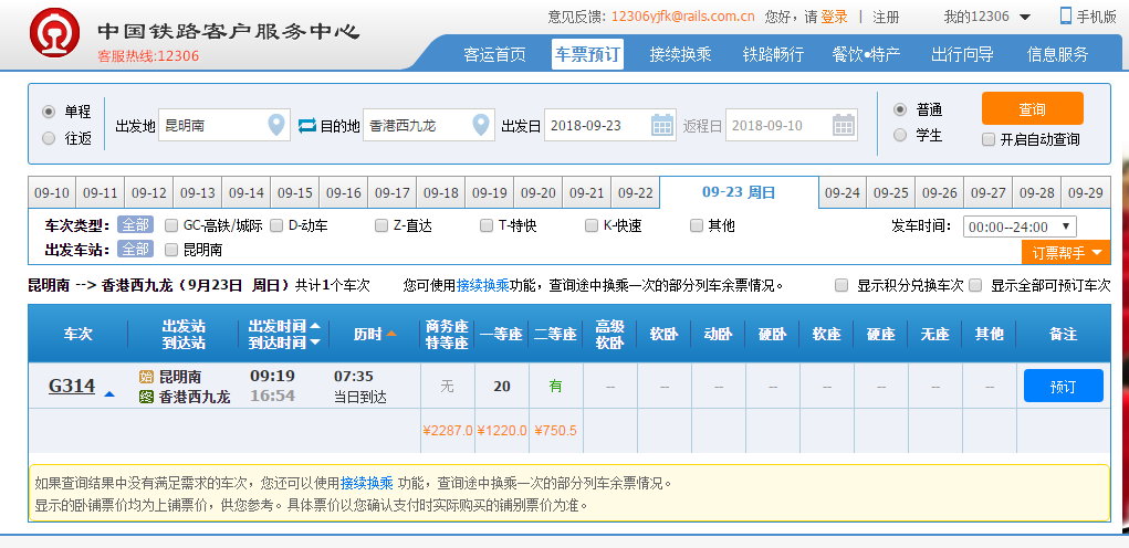 春城晚报记者在12306官网上看到,9月23日G314号(昆明南—香港西九龙)高铁首发,上午9:19从昆明南出发,下午16:54抵达香港西九龙站,可以赶上去香港吃晚餐了。