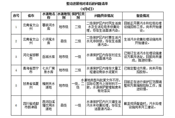 督查发现的主要问题有:云南省文山州暮底河水库等6个水源地环境问题整治工作滞后,整治工作进度不足30%,远低于全国平均水平(50%以上)。主要涉及云南省文山州(2个问题),河北省邯郸市、青海省西宁市、甘肃省临夏州和四川省成都市新津县各1个问题。