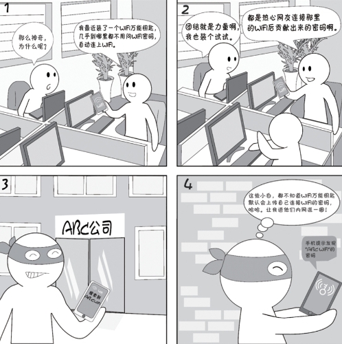 手机上的WiFi万能钥匙类的APP在安装后默认设置会自动上传你所链接的WiFi的密码。这些密码一般不会明文给出,只会在链接WiFi时自动输入,但曾曝出漏洞用一个APP能读出检测到WiFi的密码,这就可以用笔记本接入WiFi使用更强大的攻击工具了。