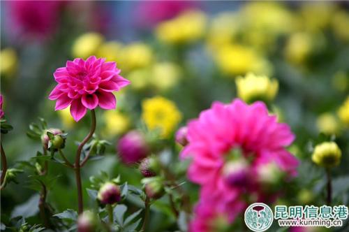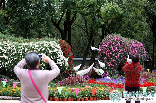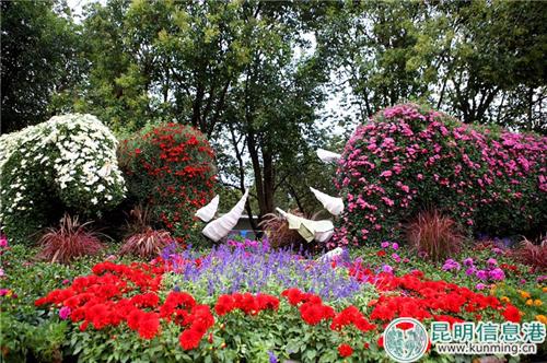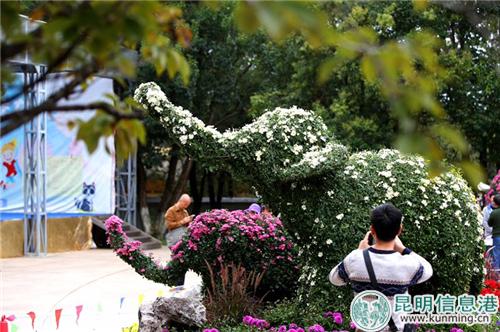 今年菊展,首次采用集中展示的方式,在昆明动物园中心区樱花广场区域设计主题景点5组,展出大型艺菊造型及罕见的菊花品种,摆放各色花卉2万盆,通过富有层次、韵律变化的景点布局,充分展示菊花技艺、造景艺术和浓郁的赏菊文化,呈现给市民和游客一场别出心裁的“菊茂献瑞、秋景满园、喜庆祥和”的菊花盛宴。