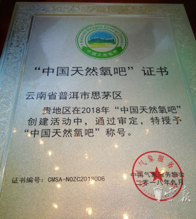 9月26日, 2018年“中国天然氧吧”创建活动发布会在北京举行,普洱市思茅区获此殊荣。