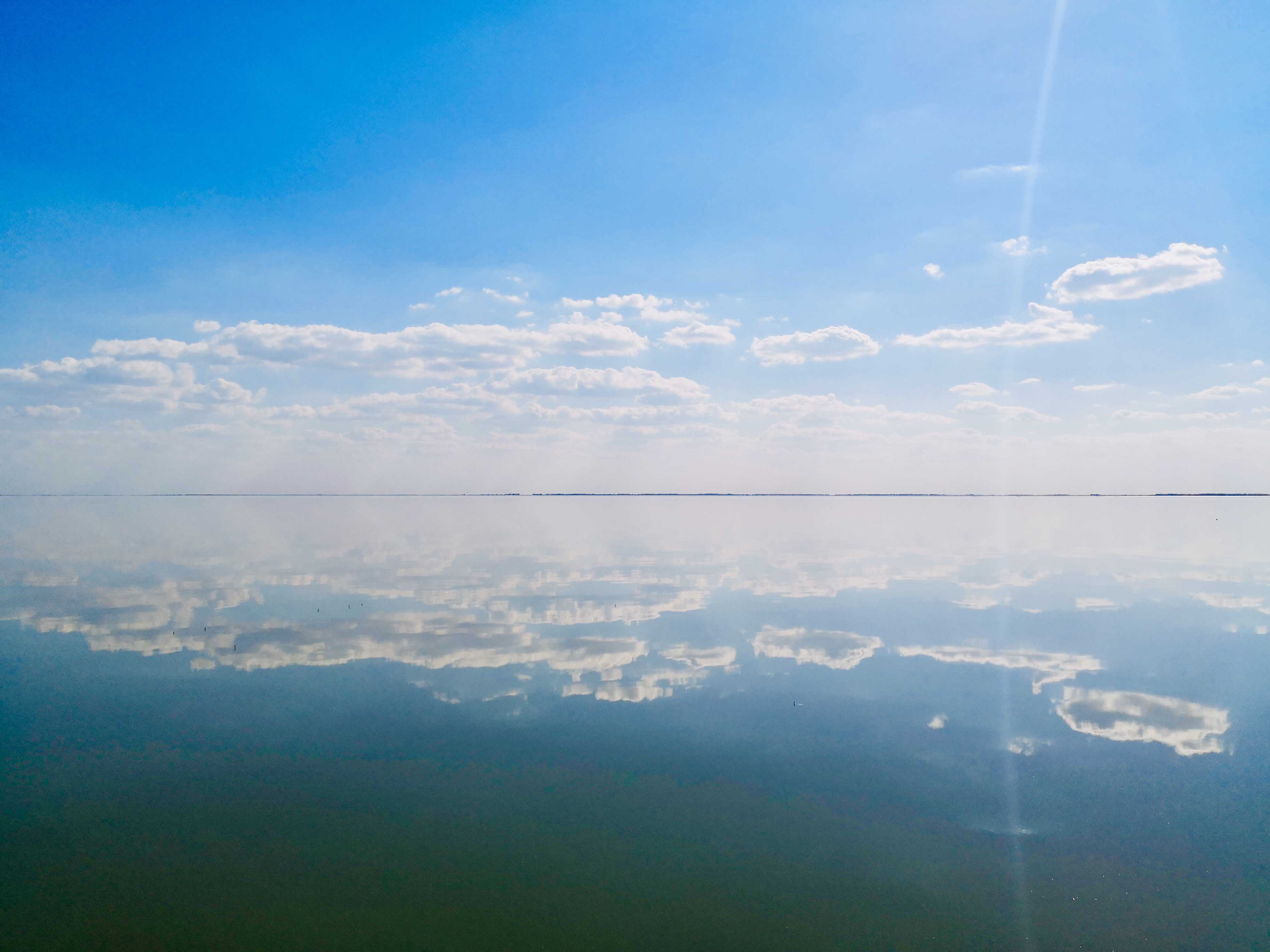△查干湖当天湖面如镜,让人仿佛置身平行世界的交汇点。(央视记者王萌萌拍摄)