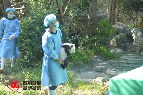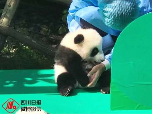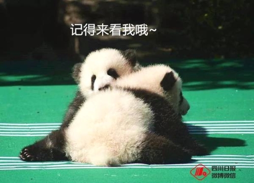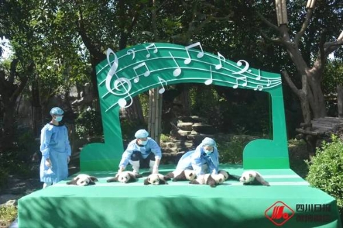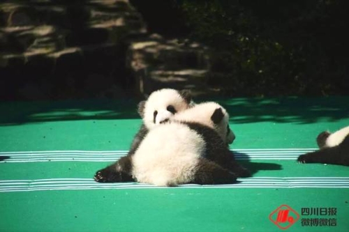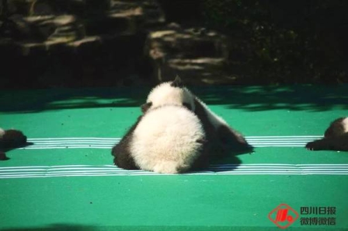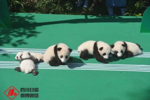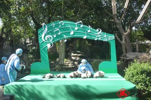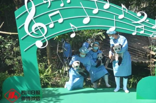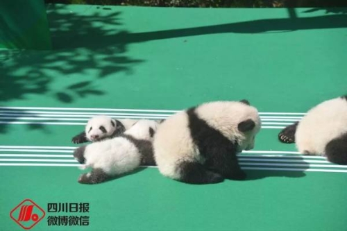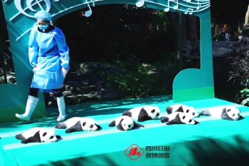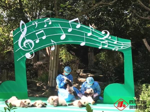 上午10 点30分左右,在成都熊猫基地太阳产房活动场,由7只新生大熊猫宝宝组成的“太阳天团”依次被饲养员抱出场外,7只可爱的大熊猫宝宝有序的趴在画有五线谱的地毯上,黑白相间的大熊猫宝宝好似一个个音符!