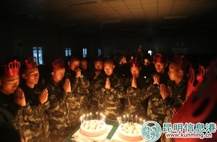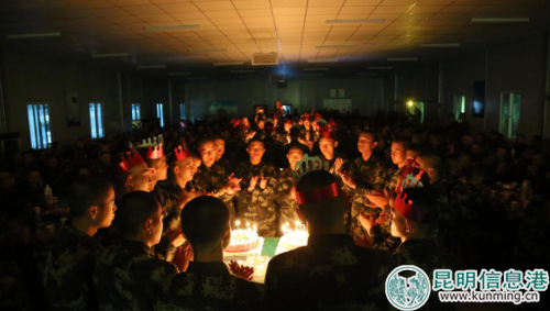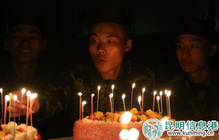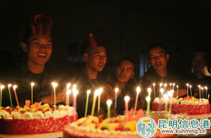 昆明信息港讯 记者丛林 通讯员叶熙 晏庭约 烛光闪闪,笑声阵阵,精美的生日蛋糕摆放在食堂餐桌的中央,当温馨的生日歌唱起,战友们祝福的掌声响起,一场精心准备的集体生日晚会在武警昆明支队新兵大队拉开序幕,新训官兵欢聚一堂,共叙情怀,为过生日的新战友送上美好的祝福。