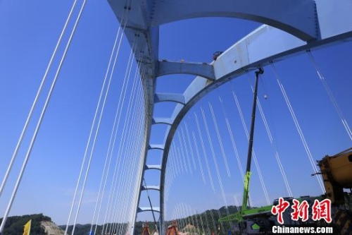 工人在高空施工平台对拱面进行作业。 谢耘 摄