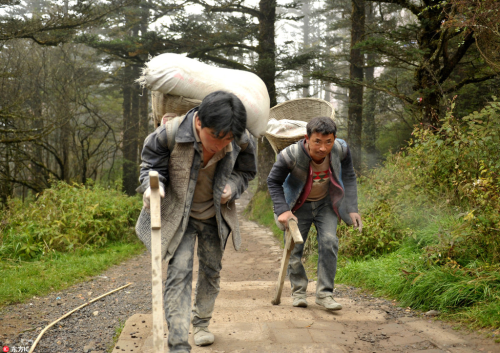10月5日,海拔3000多米的峨眉山金顶,一些山道阶梯、宾馆正在维修,因无法使用机械,背山工们一次要背200斤左右的建材步行一公里的上行山道,每天往返10余趟。(图片来源:东方IC)