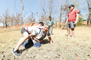 村里的孩子从小就参加摔跤比赛。记者王俊星/摄