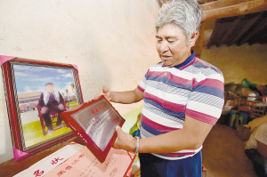 李有贵时常在父亲的遗像前,整理非遗传人的证书和奖状,以此方式缅怀父亲。记者王俊星/摄