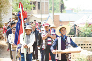 村里举办民俗摔跤比赛时,祈福的队伍都要从村子穿过。记者王俊星/摄