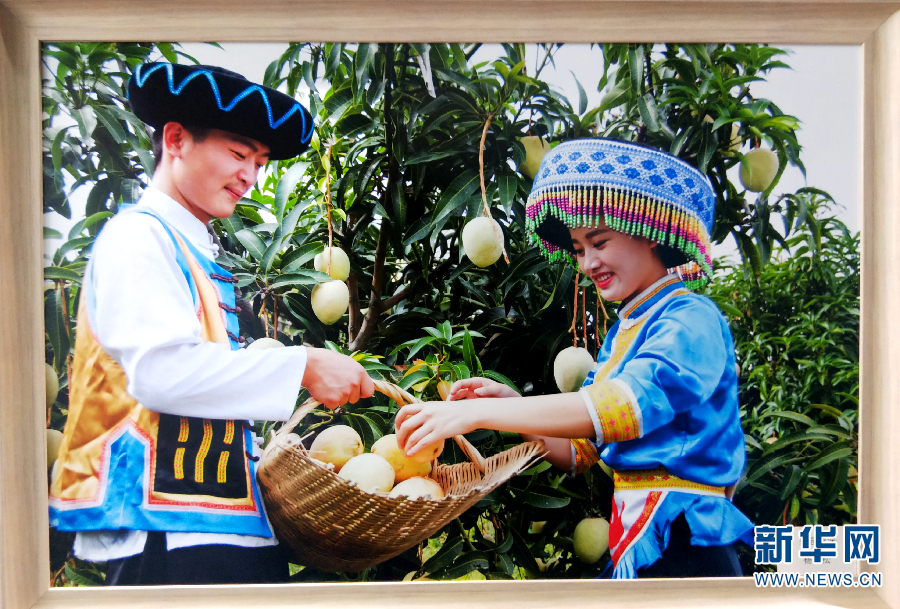 在昆明长水国际机场出发大厅内展示的丽江摄影作品《果园情深》。