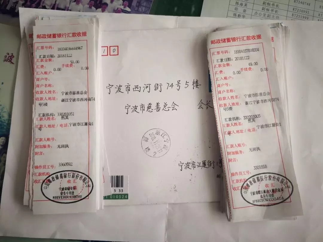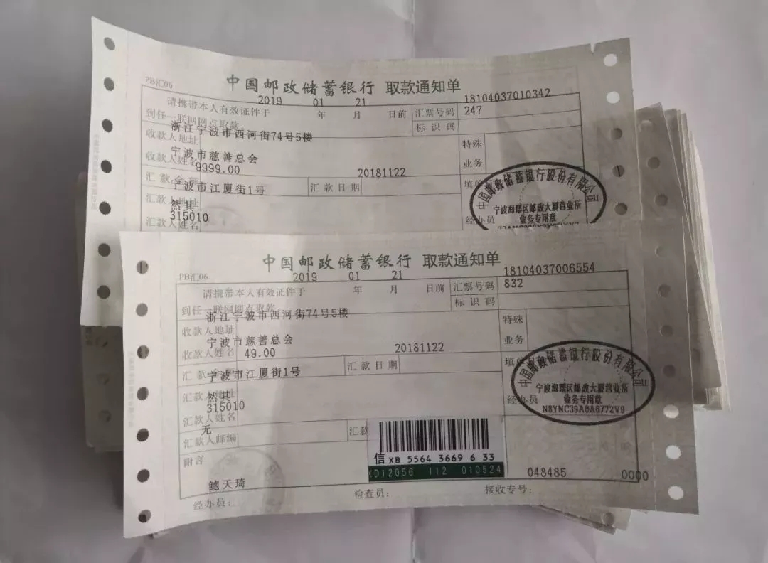 11月23日上午10点30分左右,宁波市慈善总会工作人员收到邮局送来的51张取款通知单(其中9999元50张、50元1张),合计50万元,取款单上显示汇款人为“然其”。这次是“顺其自然”第20次捐款,已累计捐款1005万元。