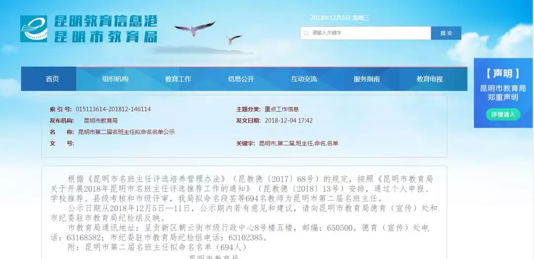 昆明信息港综合 12月4日,昆明市教育局网站公布了昆明市第二届名班主任拟命名名单,共694名教师上榜。