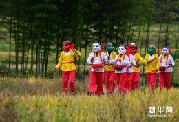 12月25日,在福州大戏院,演员表演畲族广场舞《畲乡渔鼓响四方》。 12月25日晚,福建优秀舞蹈作品展演活动在福州举行,集中展示福建省近年来舞蹈创作的丰硕成果和舞蹈表演水平,来自全省9个单位的13个作品参加展演。新华社记者 宋为伟/摄