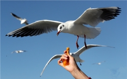 1月1日,一名游客在大观公园里给红嘴鸥喂食。
