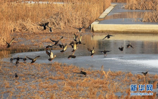 青岛市城阳区白沙河候鸟栖息地里越冬的鸟类(1月1日摄)。