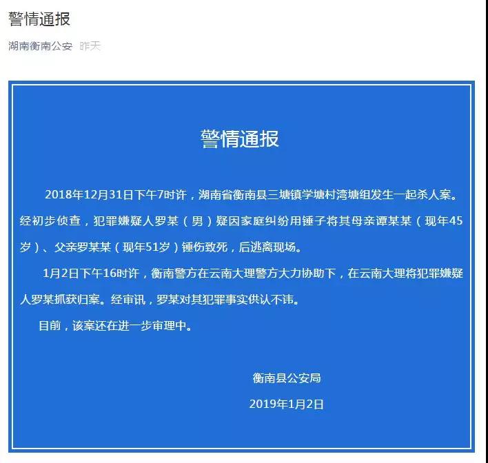 昆明信息港综合 针对2018年12月31日发生的“13岁学生罗某锤杀父母案”,湖南省衡南县公安局在1月2日发布警情通报,嫌疑人罗某已于1月2日16时许在云南大理落网。