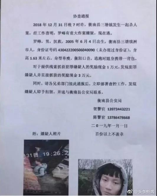 2018年12月31日晚18时许,衡南县三塘镇发生一起凶杀案,在场2人死亡。一名2005年出生的嫌疑人在杀害父母后逃离。