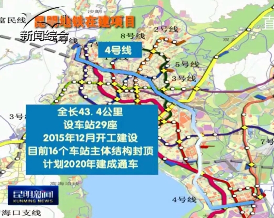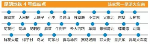 昆明轨道交通4号线是昆明轨道交通的第4条线路,从昆明西北的五华区普吉陈家营到昆明火车南站,经过高新、五华、盘龙、官渡、经开,再到呈贡。