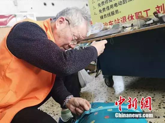 刘镜辉为旅客缝补断掉的手提袋带子。刘曼 摄