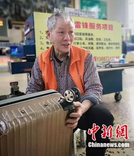 为了便于旅客发现,刘镜辉特意把小推车放在长沙火车站候车大厅显眼的位置,自己便默默地坐在小板凳上,免费为需要帮助的旅客修修补补。这一坐,就是42年。