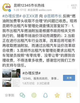 乘坐出租汽车需要在计价器基础上加收燃油附加费这一规定一直争议颇多,近日,有市民通过微博向昆明12345市长热线反映“燃油附加费零头收取不合理”的问题,已经得到了昆明市出租汽车管理处的答复,管理处表示,当前正在进行出租汽车行业改革,改革后将可能不再收取燃油附加,而通过出租汽车运价改革综合收费。