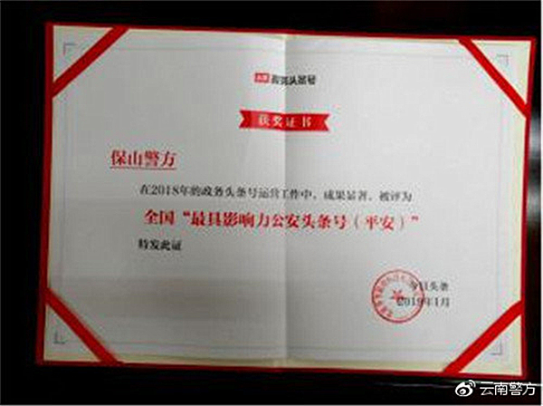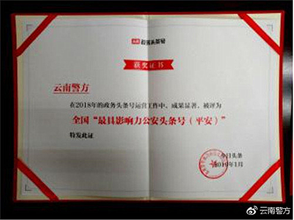 昆明信息港讯 记者合宇聪 日前,“今日头条”通过对全部政务头条号、政务抖音号的综合评估,评出了2018年度政务头条号、2018年度政务抖音号、2018年度最佳政务抖音短视频。其中,云南省公安厅官方头条号“@云南警方”、保山市公安局官方头条号“@保山警方”、昆明市寻甸县公安局官方头条号“@警方视讯”获评2018全国“最具影响力公安头条号”。