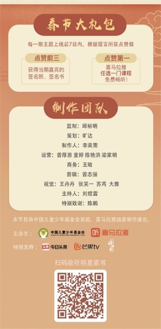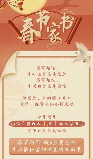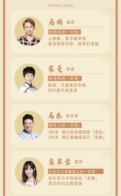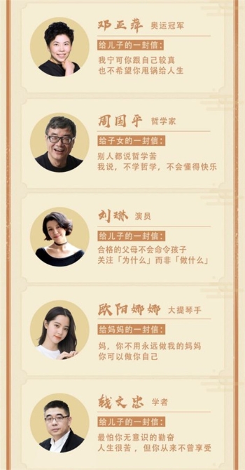 未来一个月中,参加《春节家书》活动并录制音频的还将有著名学者周国平、钱文忠,联合国前副秘书长沙祖康,青年演员欧阳娜娜、任家萱、梅婷、任容萱等,其他嘉宾也会陆续参与进来。他们或是在信中娓娓道来儿时父母趣事,或是语重心长地为子女指引人生的方向。
