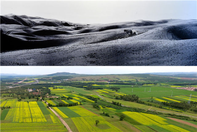 上图为治理前,山西省右玉县随处可见半流动沙丘(资料照片);下图为山西省右玉县威远镇治理后的荒沙地,如今已郁郁葱葱。(新华社记者詹彦摄·2017年)
