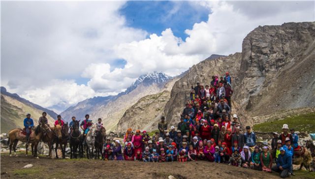 2017年7月21日,喀拉塔什其木干村村民在夏牧场合影。(新华社记者江文耀摄·2017年)