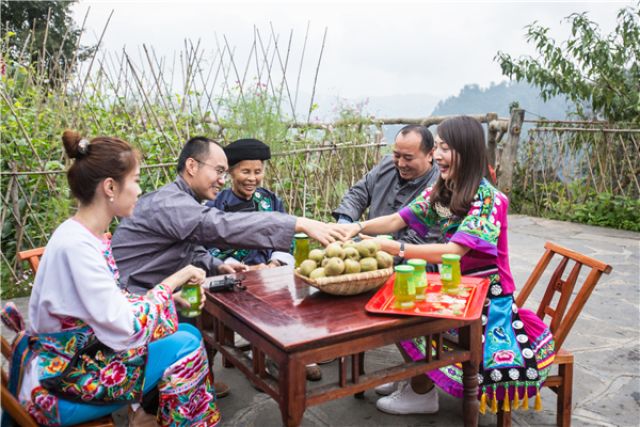 在湖南省湘西土家族苗族自治州花垣县双龙镇十八洞村,村民邀请远方的客人品尝湘西特产猕猴桃和猕猴桃果汁饮料。(新华社记者王天聪/摄·2017年)